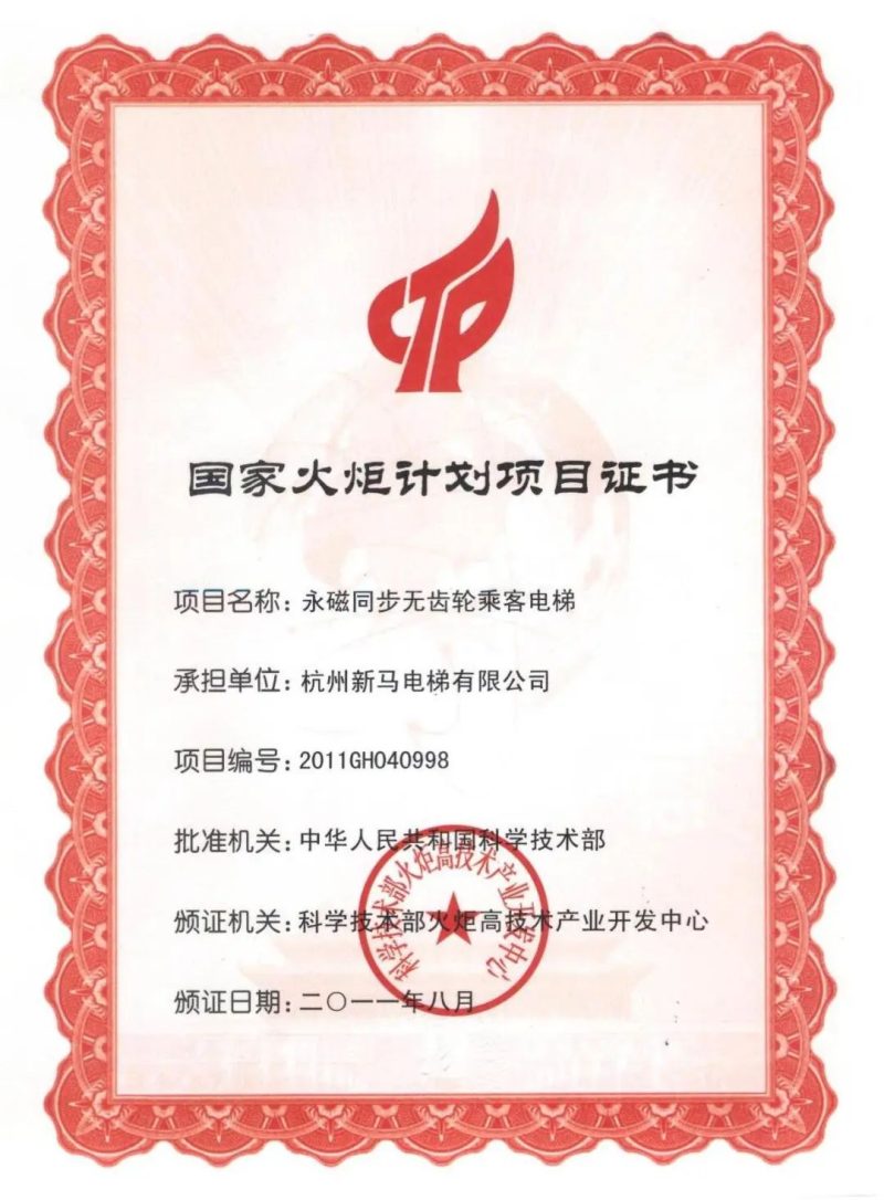 2002年新馬電梯在國內(nèi)率先成功研發(fā)并推出了永磁同步無齒輪綠色節(jié)能環(huán)保型乘客電梯產(chǎn)品,該系列產(chǎn)品以出色的節(jié)能性、超低的運行噪音、更平穩(wěn)的乘坐舒適感、無需換油的便捷維護等優(yōu)點贏得了廣大客戶的喜愛。并于2011年通過“國家火炬計劃項目認證”。